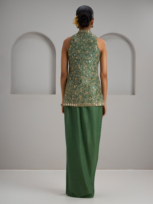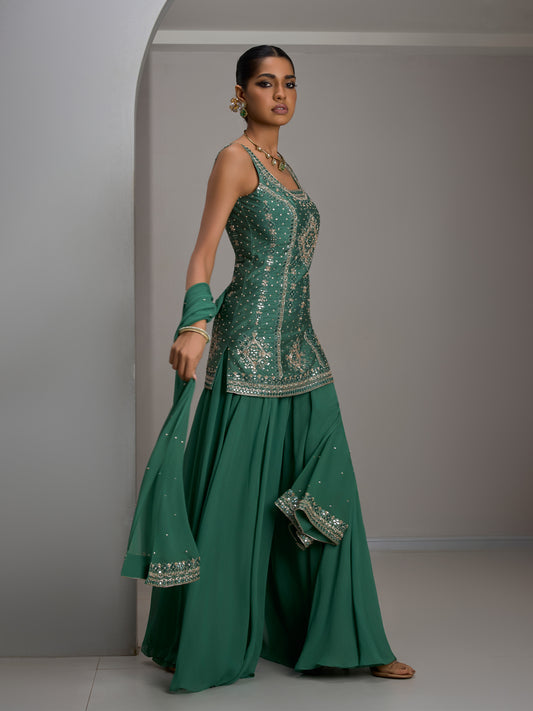 Sage Green Tunic Kurta With Dupatta And Flared Sharara Pant
