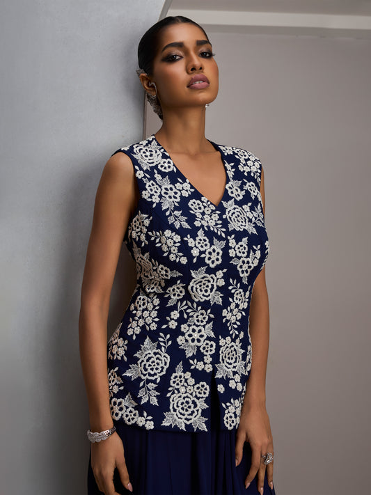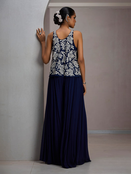 Navy Hand Embroidered Sleeveless Jumpsuit