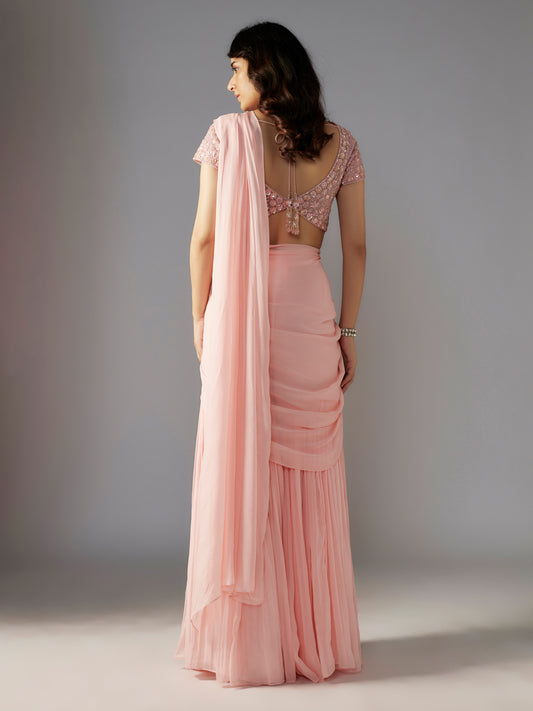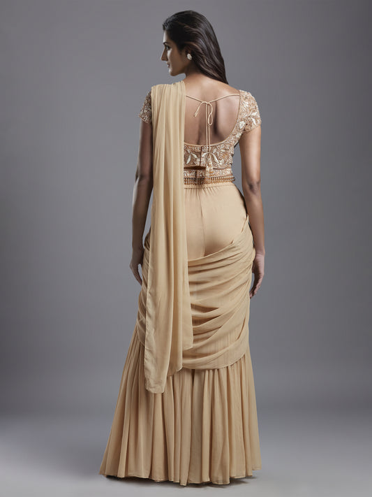 Nude Net White and Rose Gold Floral Work Blouse with Nude Georgette Draped Saree and Belt