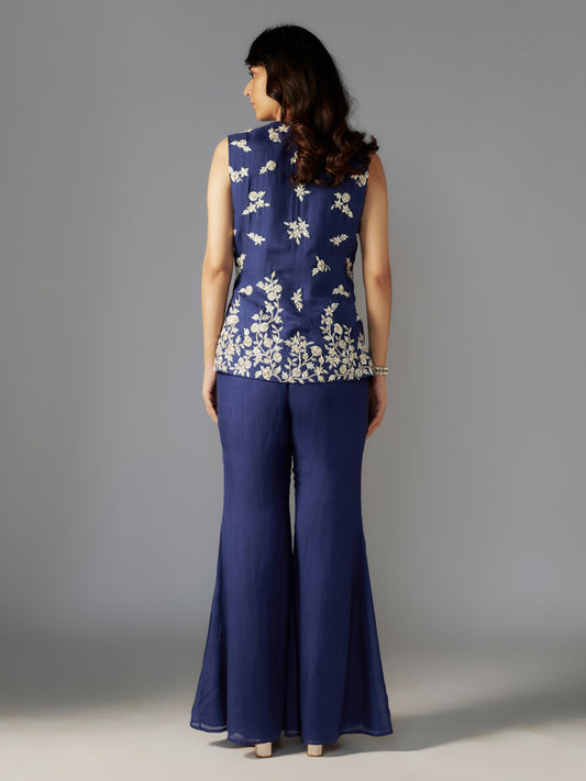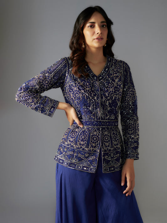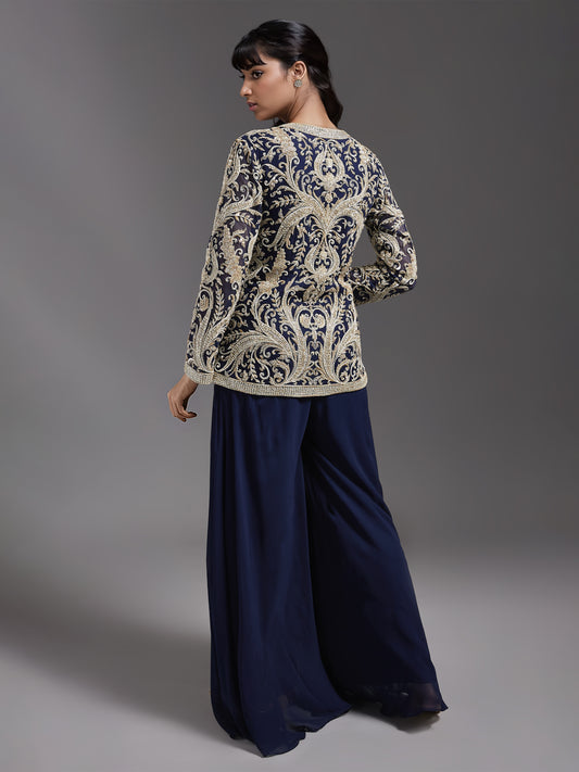 Navy Net Jacket with Ivory Embroidered and Sharara Set