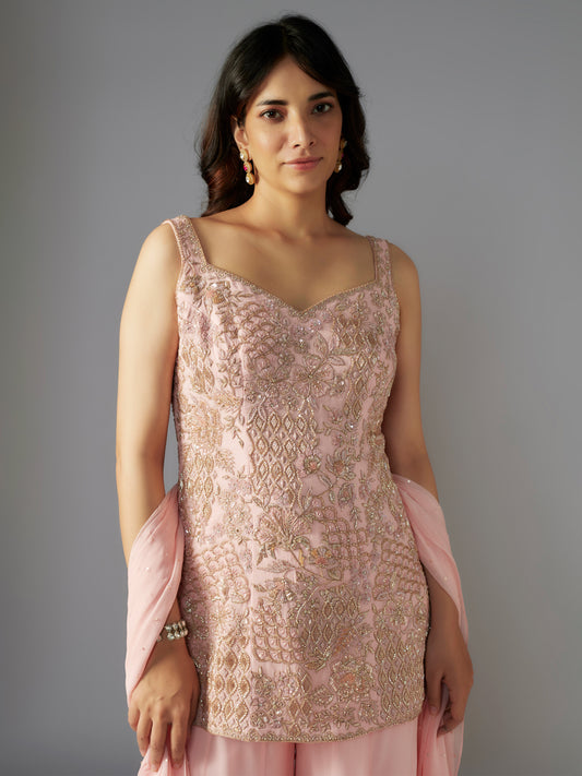 Pink Hand Embroidered Georgette Kurta and Sharara Set