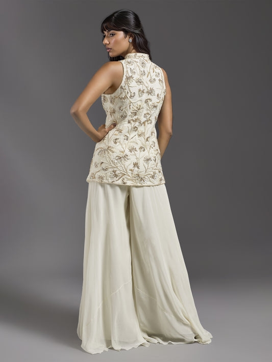 Ivory Net Floral Embroidered Chinese Collar Jacket with Georgette Flared Pants