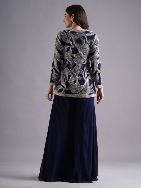 Navy Net Abstract Line Blouse with Hip Ruched Saree and Belt