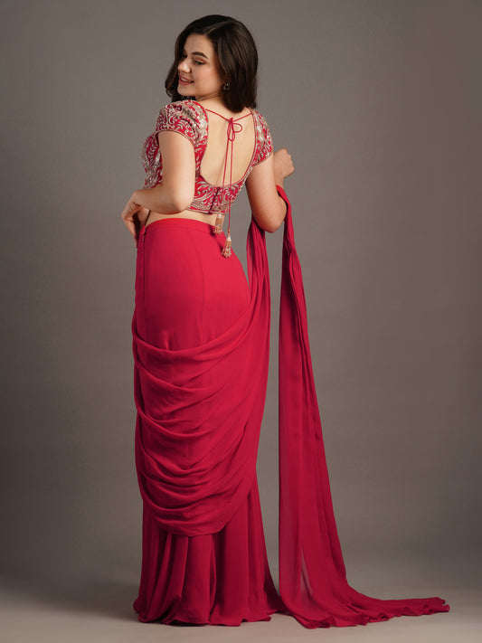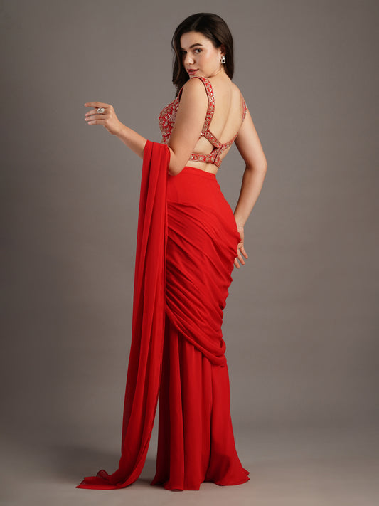 Cherry Red Georgette Makai Round Neck Blouse With Kali Mermaid Georgette Draped Saree And Belt