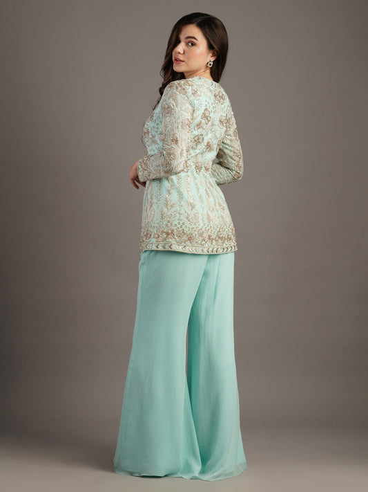 Ivory Net Mandala Sleeveless Jacket With Georgette Kali Pants