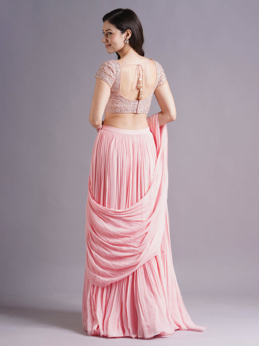 Pink Net Abstract Line Emb Blouse with Tiered Draped Saree and Belt