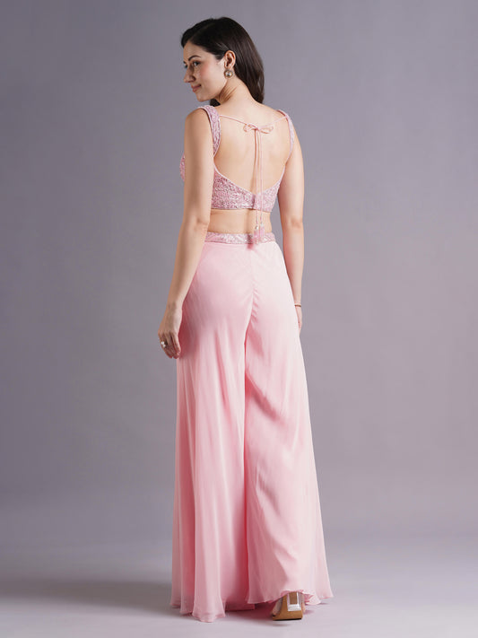 Pink Net Round Armhole Blouse with Sharara Pants and Choker