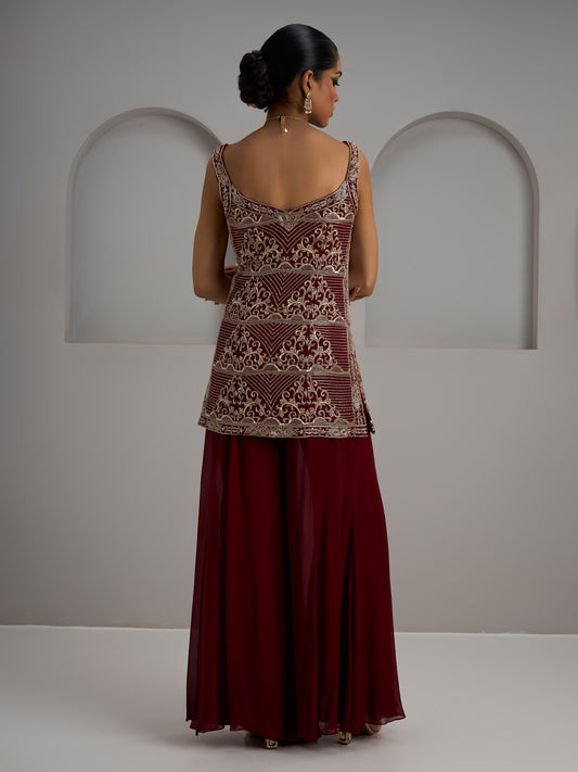 Black Crop Top With Ivory Work Paired With Flared Sharara Pants And A Stole