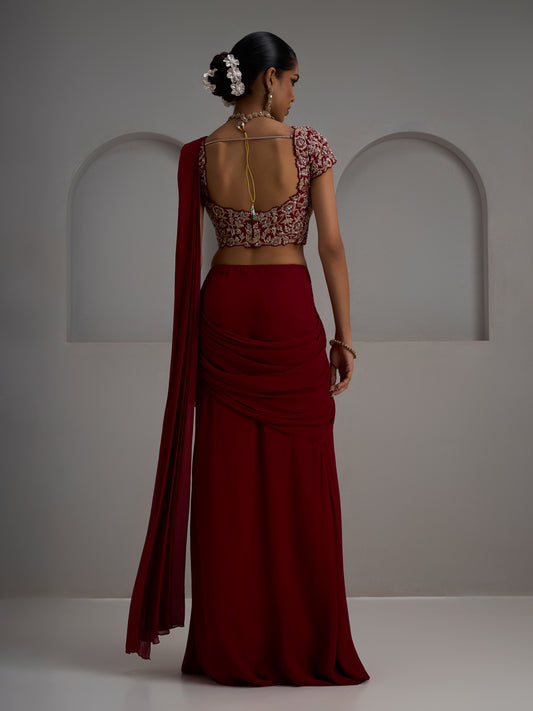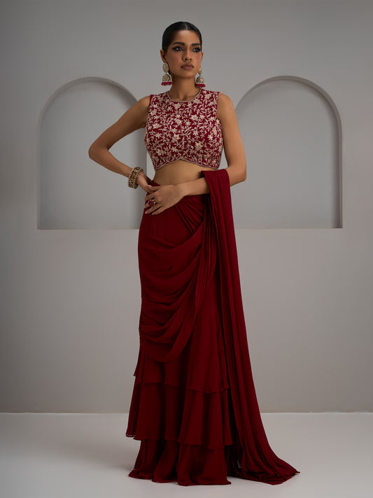 Alamkara Red Georgette Floral Blouse Paired With Three Layered Drape Saree And Belt