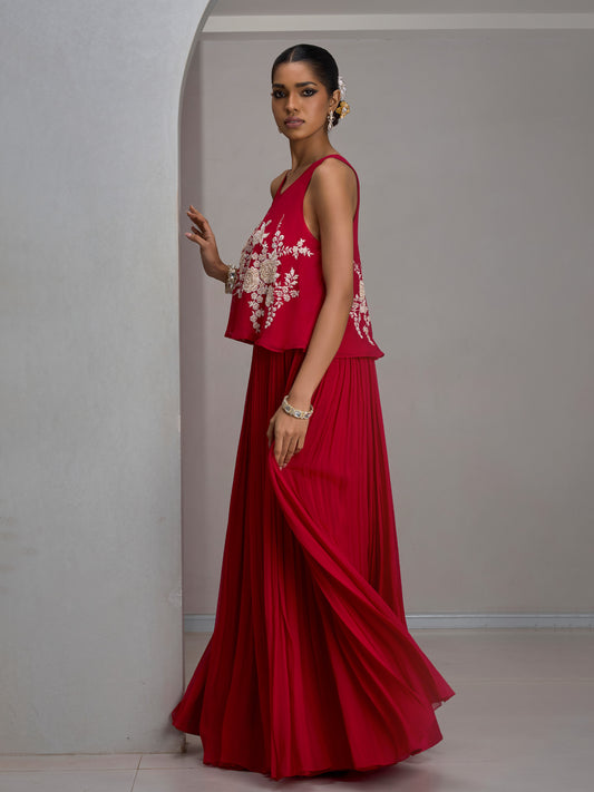 Cherry Red Georgette Spaghetti Top With Gathered Skirt And Choker Dupatta