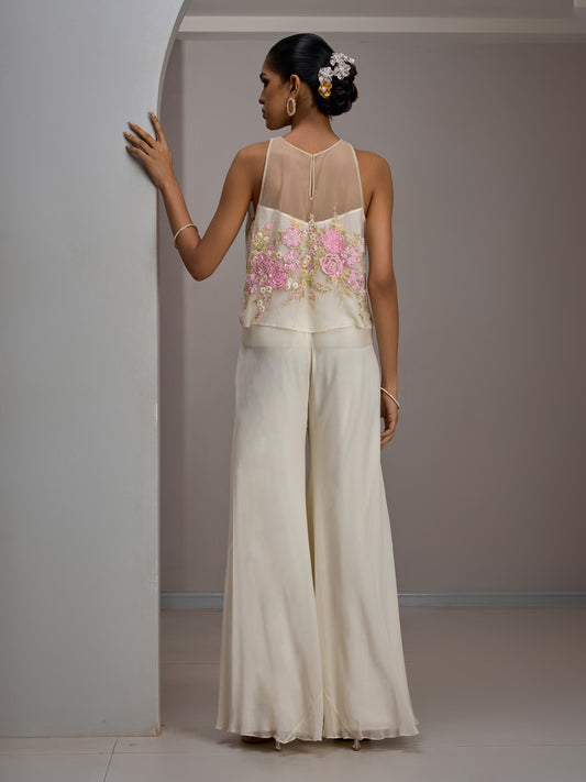 Ivory Net Crop Top With Pastel Embroidered Work And Georgette Flared Sharara Pants