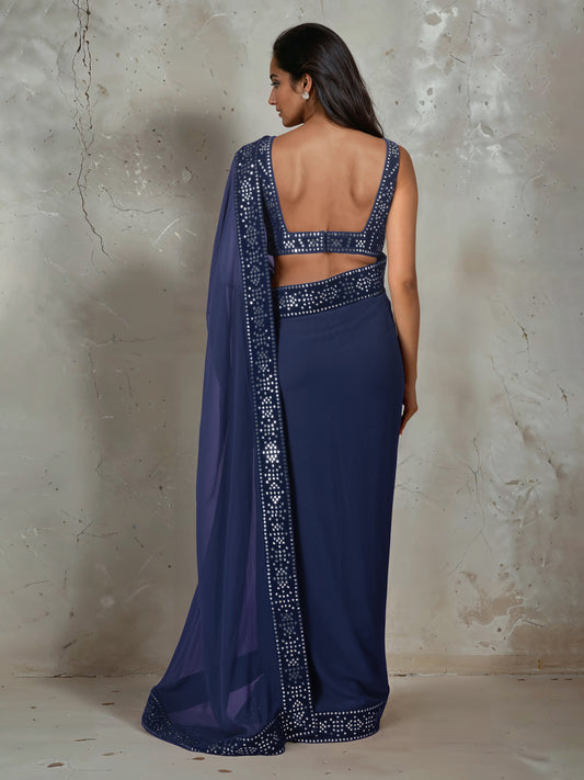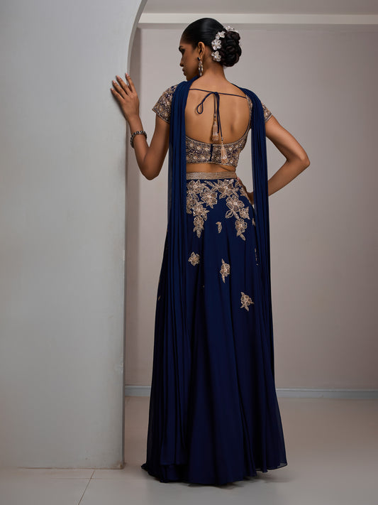 Navy Georgette Halter Crop Top With Georgette Flared Sharara Pants And Stole