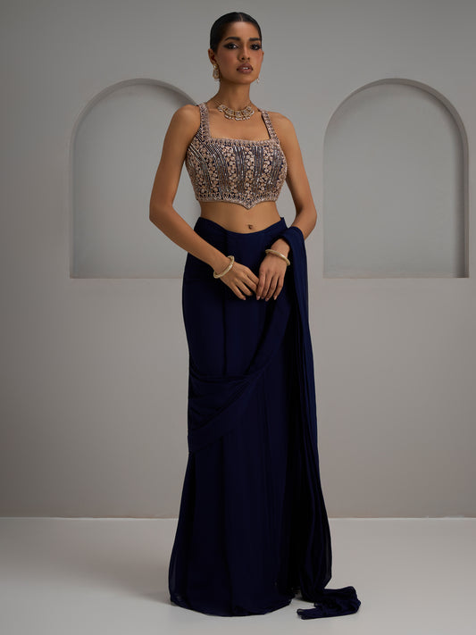 Navy Net Blouse With Hip Rushed Saree And Belt