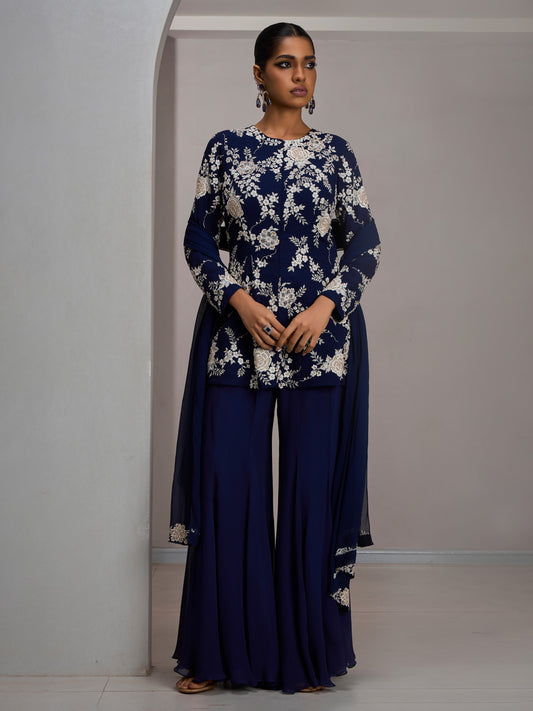 Navy Crop Top With Georgette Flared Sharara Pant And Stole Dupatta