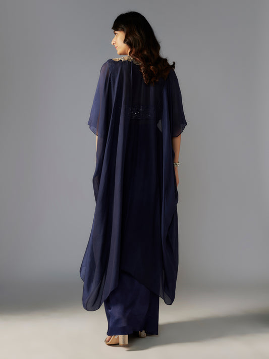 Navy Hand Embroidered Modal Satin Draped Skirt Set with Cape