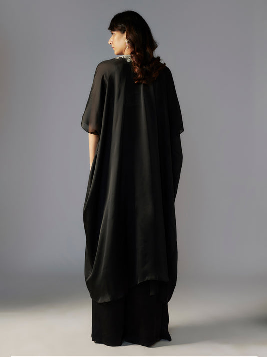 Black Embroidered Crepe Satin Sharara Set with Cape