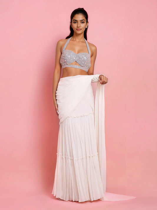 Hand Embroidered Denim Blouse with Ivory Georgette Drape Saree and Belt