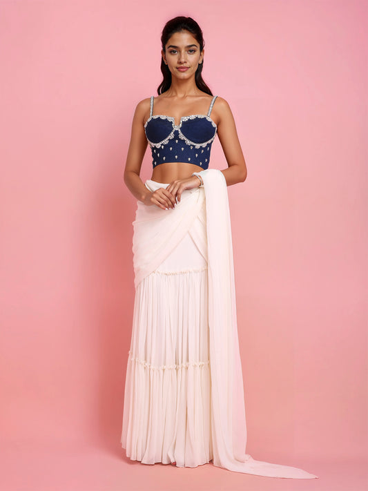 Hand Embroidered Denim Corset with Ivory Georgette Drape Saree