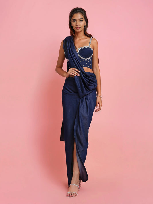 Hand Embroidered Denim Corset with Denim Drape Saree with Slit
