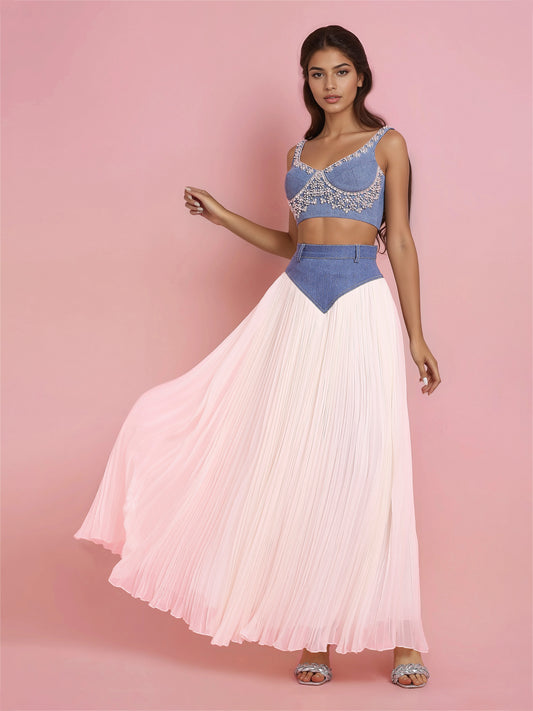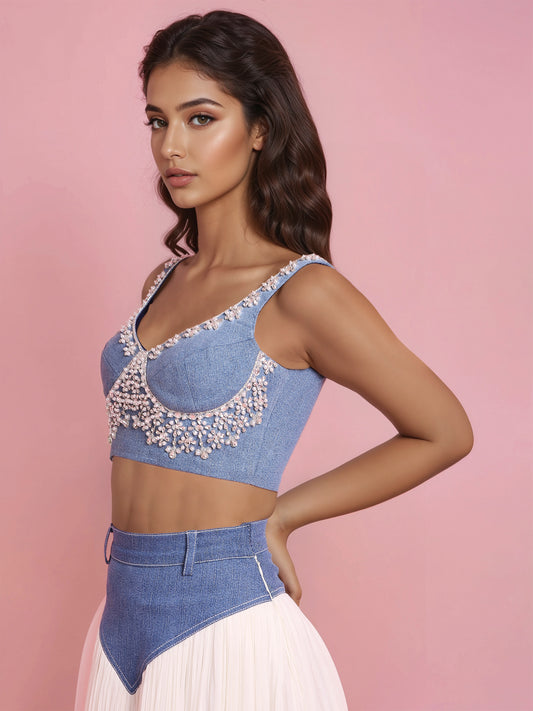 Hand Embroidered Denim Corset with Denim-Ivory Georgette Basque Skirt