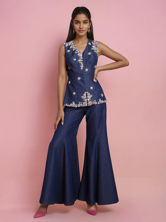 Hand Embroidered Denim Jacket With Blue Denim Pant