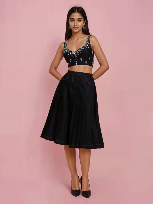 Hand Embroidered Denim Blouse with Blue Denim Skirt and Belt