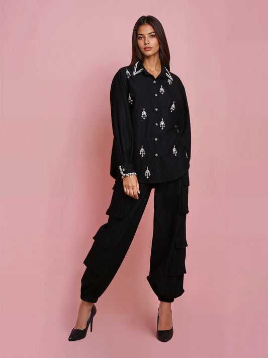 Hand Embroidered Black Denim Shirt with Black Cargo Pant