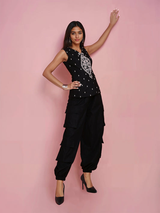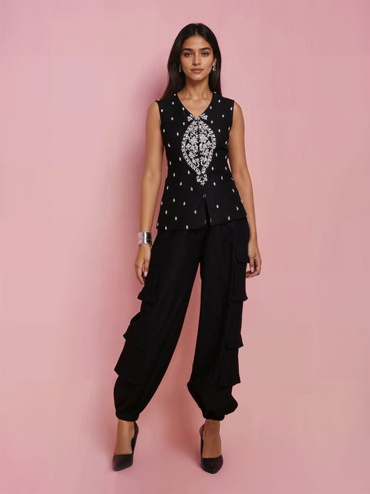 Hand Embroidered Black Denim Jacket with Black Cargo Pant