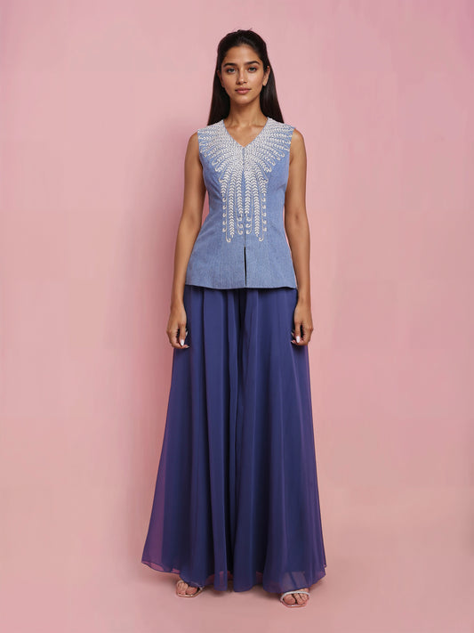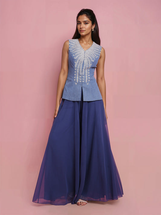 Hand Embroidered Denim Jacket with Blue Georgette Flared Sharara