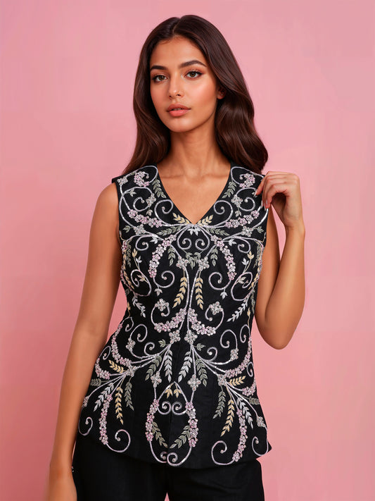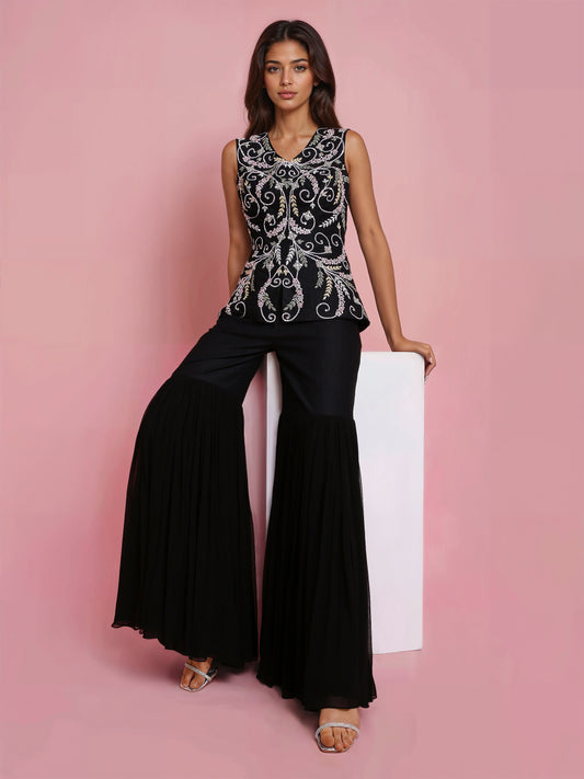 Hand Embroidered Black Denim Jacket with Black Sharara Pant