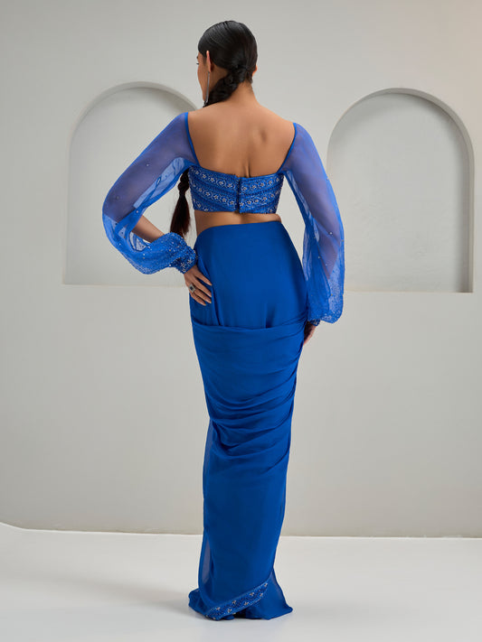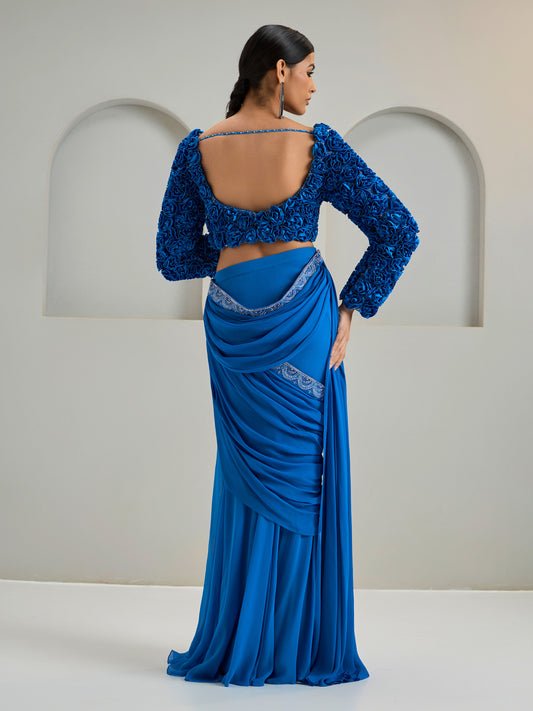 Royal Blue Embroidered Concept Blouse With Georgette Draped Saree