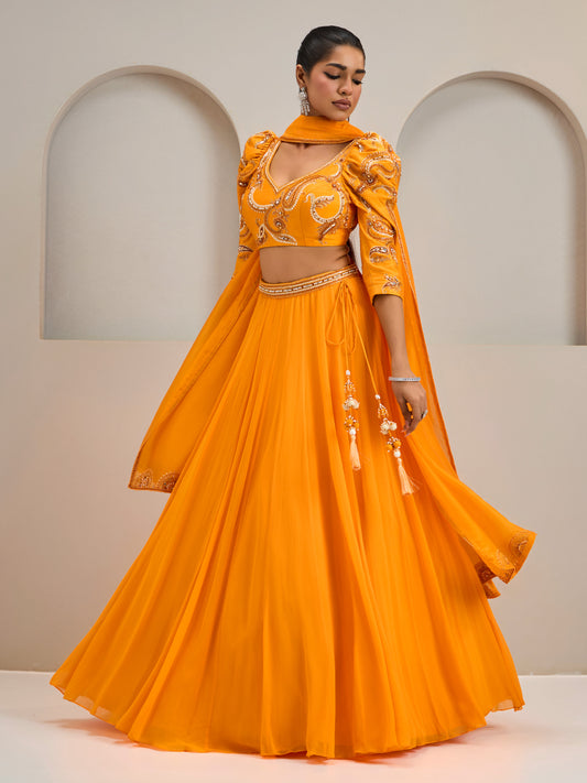 Sunset Orange Embroidered Puffed Sleeves Blouse With Lehanga And Dupatta