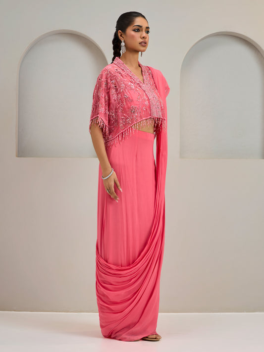 Coral Pink Organza Cape With Draped Saree