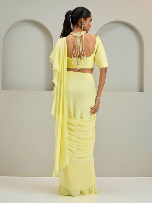 Lemon Yellow Concept Blouse With Ruffled Draped Silk Saree