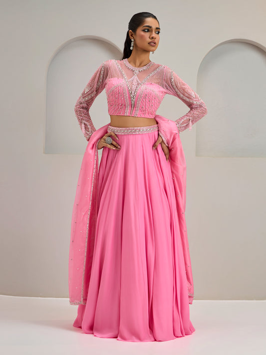 Light Flamingo Pink Embroidered Net Blouse With Lehanga And Dupatta