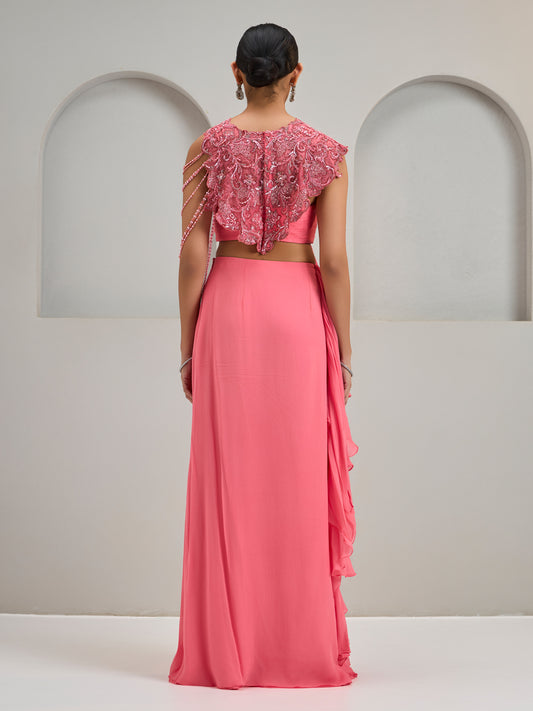 Coral Pink Organza Asymmetric Attached Cape Top With Draped Saree