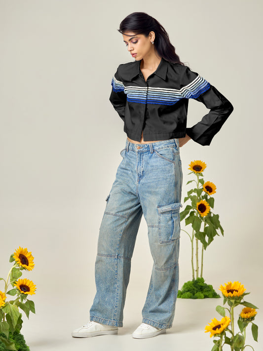 Hand Embroidered Black Denim Jacket with Black Cargo Pant