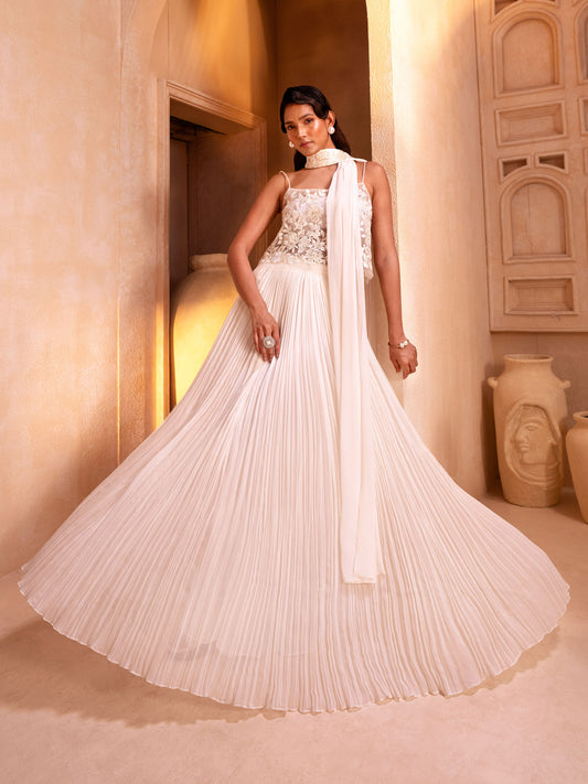 Ivory Embroidered Crop Top With Gathered skirt And Stole