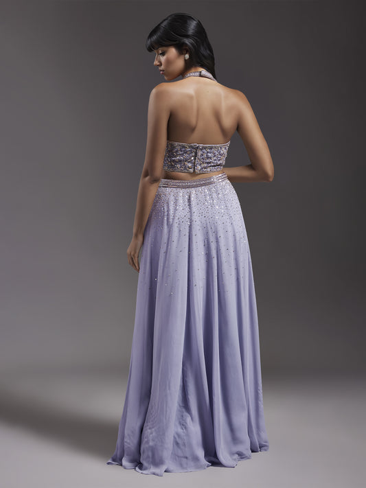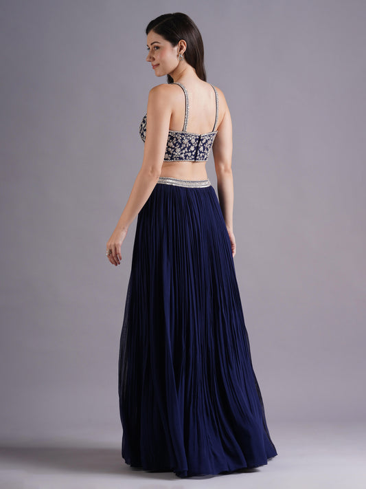 Navy Georgette Strappy Blouse with Pleated Lehenga and Choker Dupatta