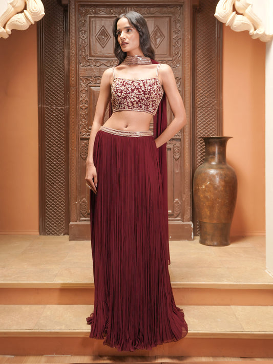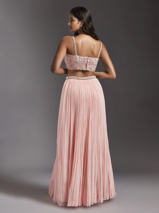 Pink Georgette Pleated Lehenga with Strappy Embroidered Blouse and Choker Dupatta