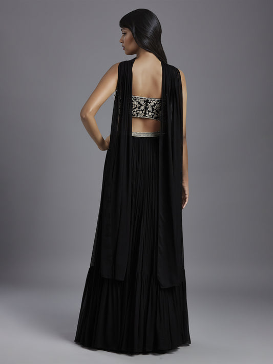 Black Georgette Gathered Skirt with Embroidered Blouse and Choker Dupatta