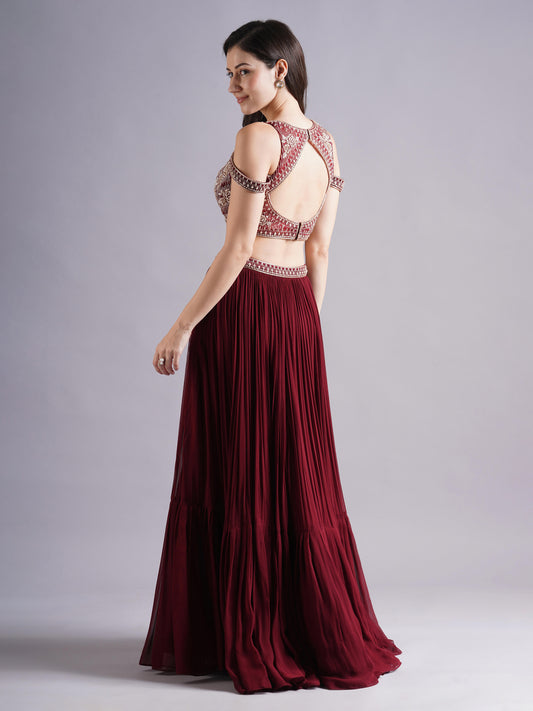 Maroon Net Cold Shoulder Rose Emb Blouse with Gathered Skirt and Choker