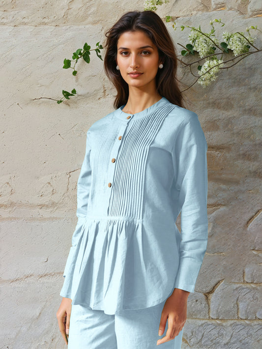 Powder Blue Cotton Linen Pleated Top