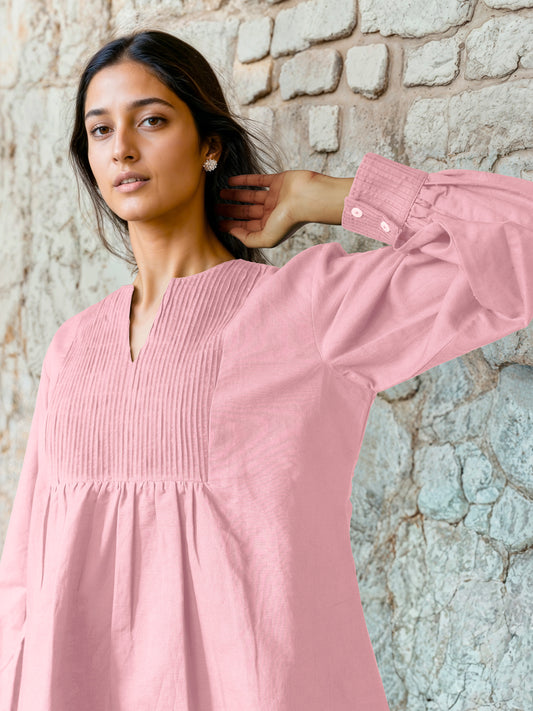 Baby Pink Cotton Linen Top with Pintuck Detailed Yoke
