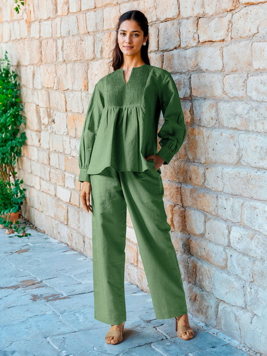 Sage Green Cotton Linen Top with Pintuck Detailed Yoke
