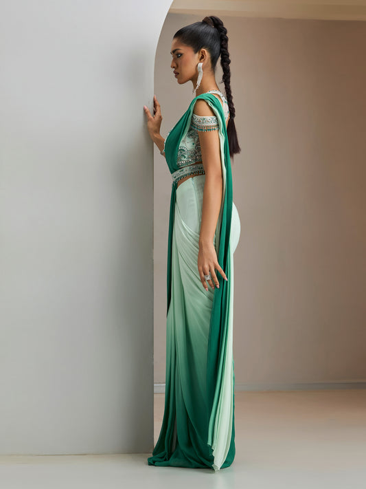 Green Net Blouse With Green Ombre Georgette Saree With Belt