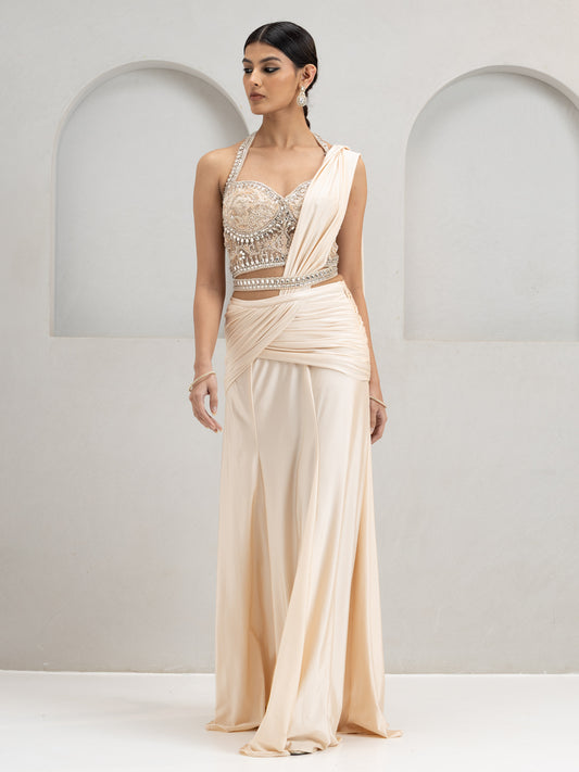 Nude Stone Embroidered Blouse With Lycra Drape Saree With Belt