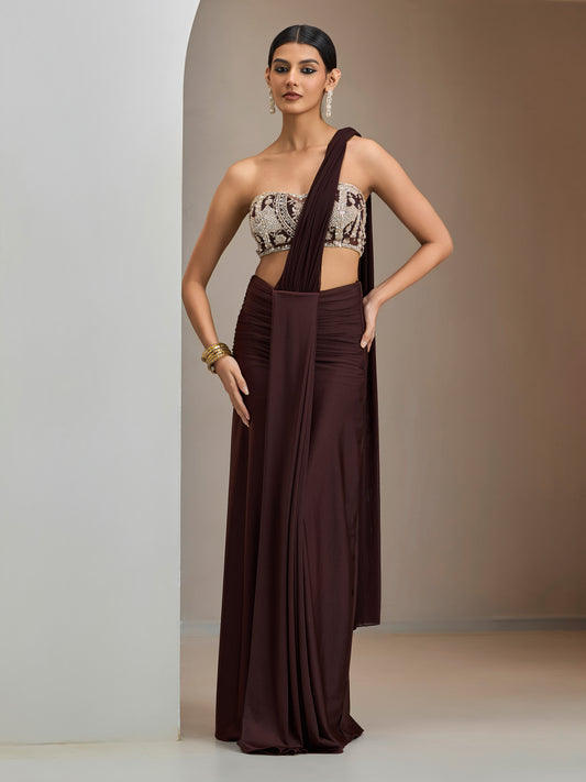 Chocolate Brown Stone Embroidered Blouse With Lycra Drape Saree