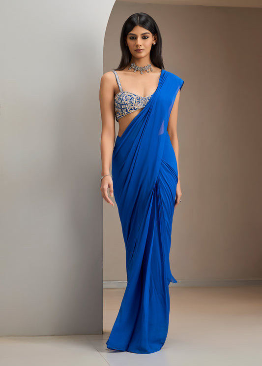 Electric Blue Net Blouse With Pre Stitched Saree