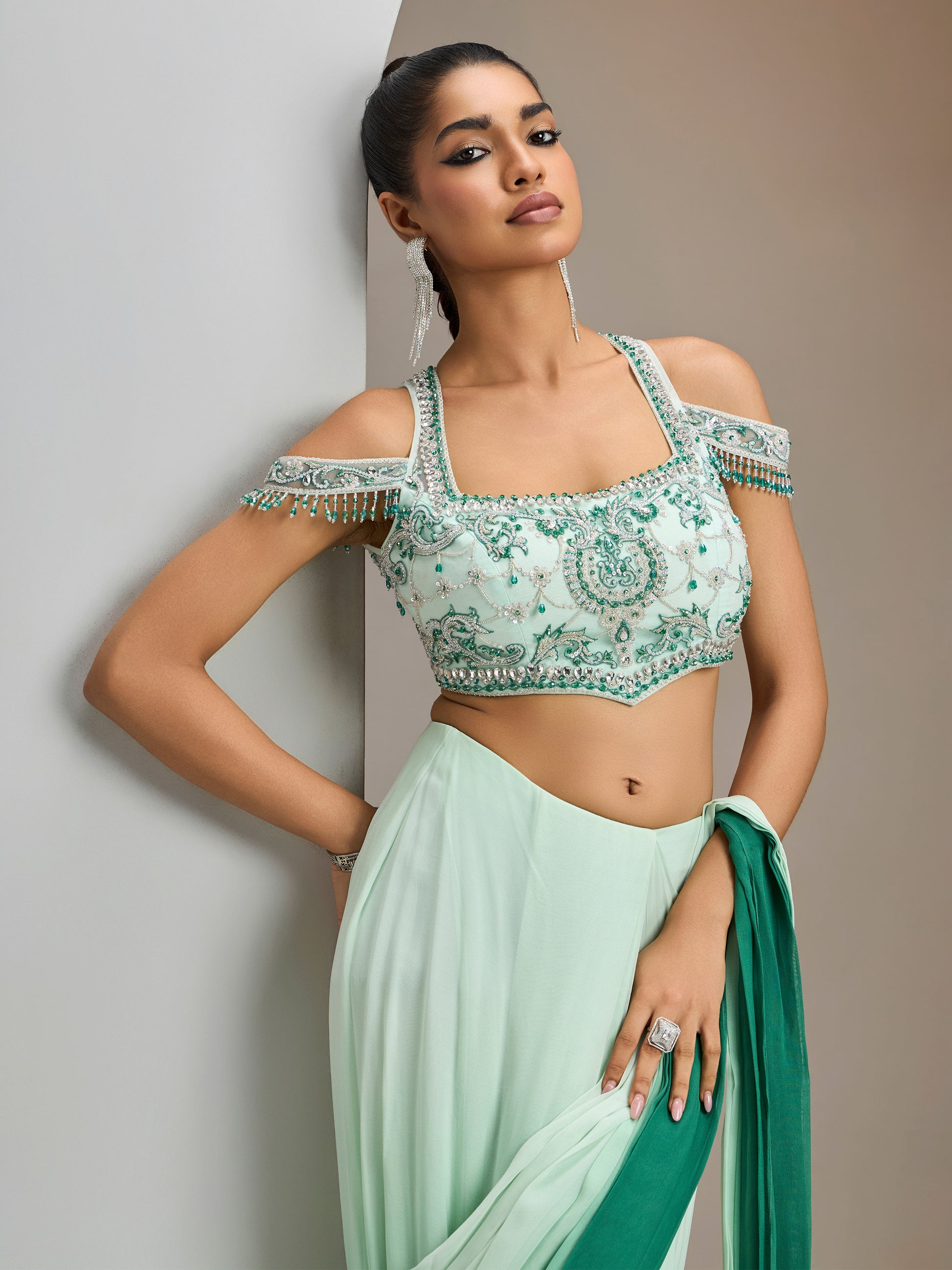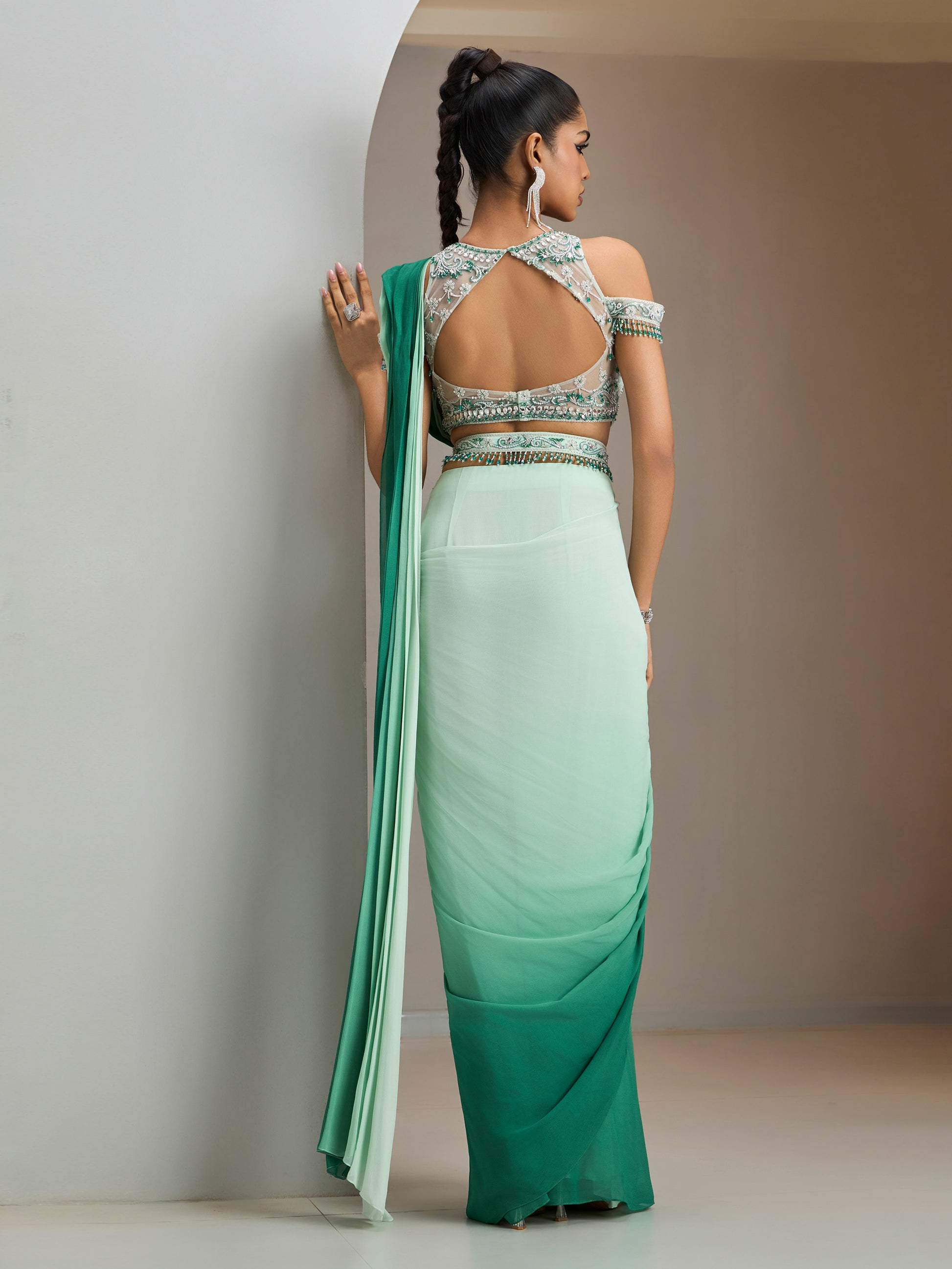 Green Net Blouse With Green Ombre Georgette Saree With Belt